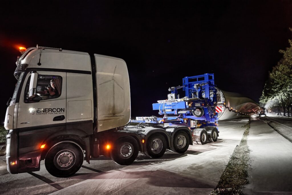 Pour assurer ces convois complexes, Enercon Logistic a investi dans trois systèmes Scheuerle RBTS, conçus pour le transport de ces pales nouvelle génération. Le RTBS se compose d’un véhicule tracteur avec une semi-remorque à 3 ou 4 essieux, d’un adaptateur de fixation pour la pale, et d’une unité arrière autoguidée. Sa conception modulaire permet une adaptation flexible aux différents types de pales et besoins de transport. Grâce à une grande hauteur de levage et à la direction adaptable de l’unité arrière, les manœuvres dans les centres-villes étroits, les ronds-points ou les marches arrière complexes peuvent être réalisées en toute sécurité et efficacité.