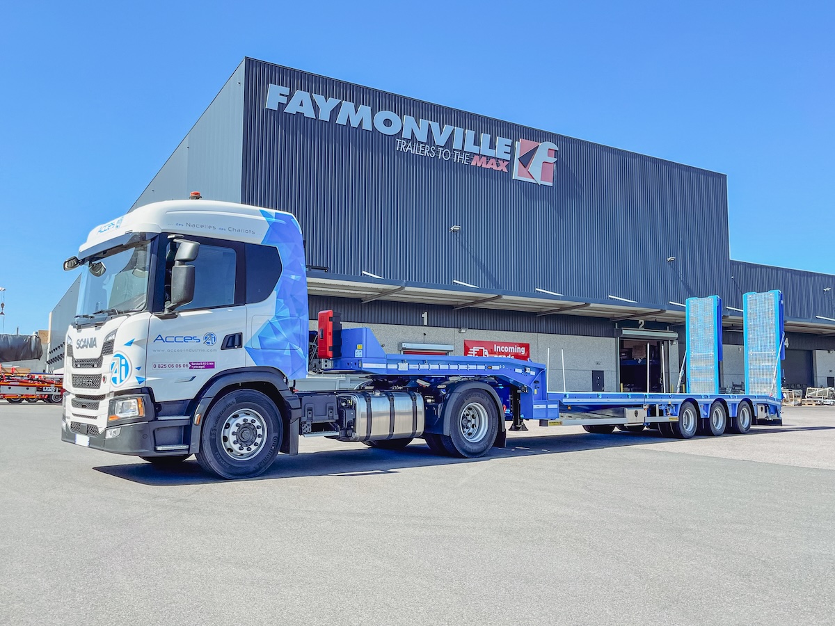 Le groupe Acces Industrie, expert en élévation et manutention, a réceptionné 16 nouvelles semi-remorques surbaissées Faymonville MultiMAX Plus. Ces véhicules parfaitement adaptés aux besoins spécifiques de ce spécialiste de la location, pour le transport des nacelles élévatrices, chariots télescopiques et autres matériels de manutention. La version MultiMAX Plus a en effet de nombreux atouts : une table élévatrice hydraulique pour l’accès au col de cygne, un plancher en caillebotis robuste, de nombreux points d’arrimage bien répartis ainsi qu’une surface de chargement de 9,6 mètres. Les rampes hydrauliques doubles s’écartent jusqu’à 3 mètres et peuvent se rapprocher à seulement 20 mm. Leur encombrement, une fois repliées, reste inférieur à 300 mm, ce qui permet à l’ensemble routier de rester sous la limite des 16,5 mètres. Enfin, la fixation rapide pour le calage des rampes et les nombreuses options d’arrimage rendent le travail du conducteur moins contraignant, tout en améliorant la sécurité des opérations.