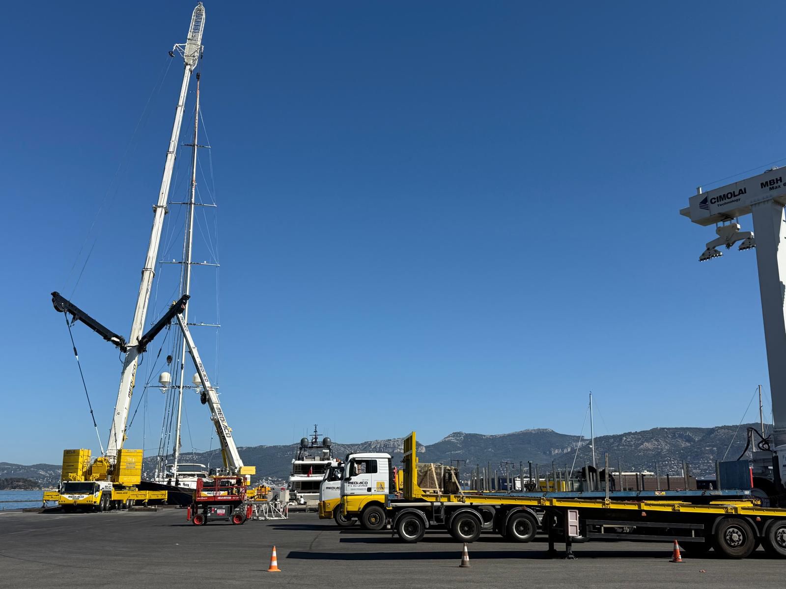 Le jour J, le mât de 17 tonnes a été levé jusqu’à 32 mètres. Les moyens déployés comprenaient une grue de 130 tonnes pour le pied de mât, une grue de 350 tonnes, et une grue de 120 tonnes. Autre difficulté, l’acheminement nocturne de la LTM 1350-6.1 à travers le petit village de Saint-Mandrier.