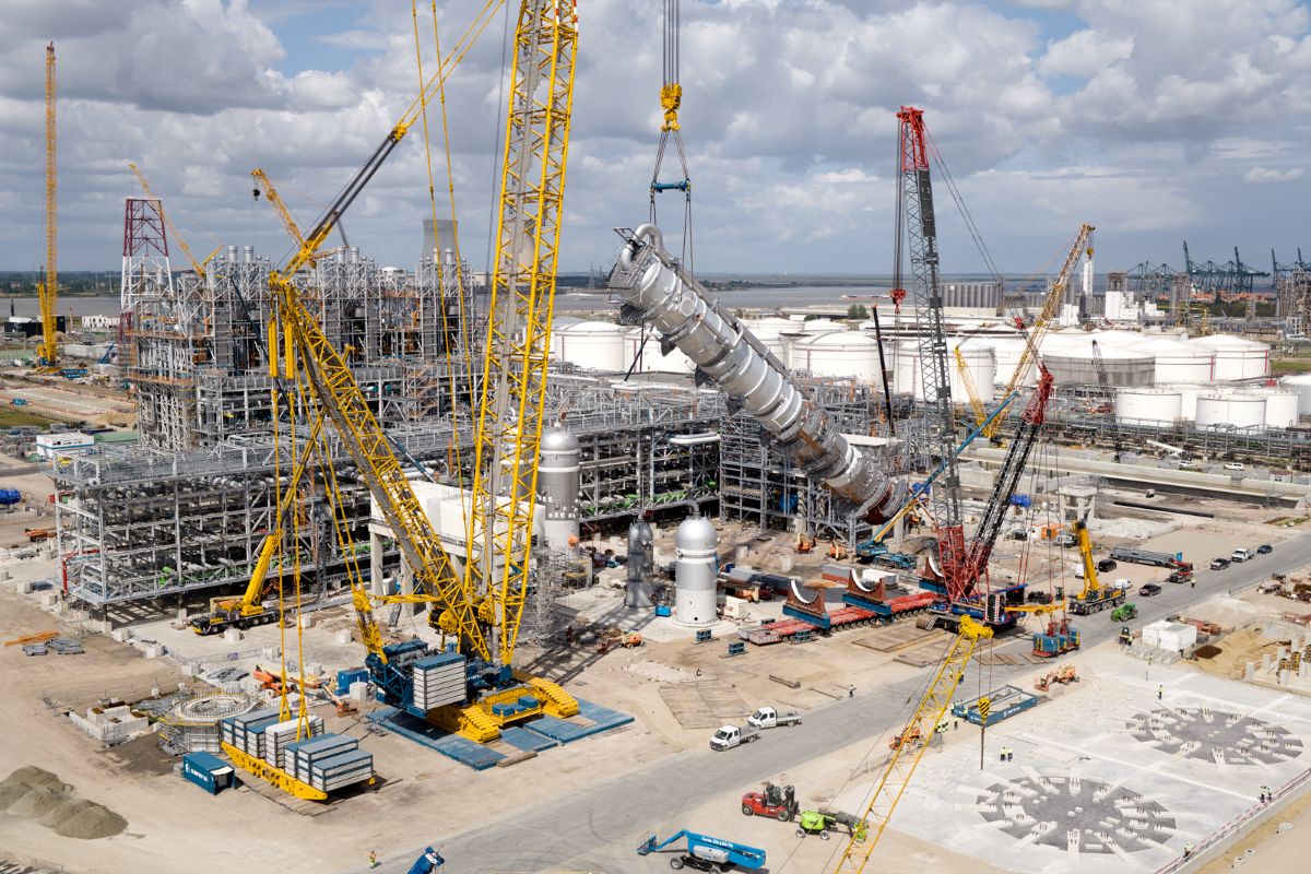 Sarens a mobilisé plus de 400 experts de 28 nationalités et une flotte impressionnante de grues comme la Liebherr LR12500-1.0 (capacité 2 500 tonnes), des SPMT avec 224 lignes d’essieux et une barge pour transporter et installer plus de 80 modules industriels, dont les énormes fours et les séparateurs C2 et C3.